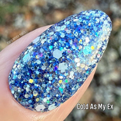 Cold As My Ex is a fierce, frosty mix of winter blues and icy holographic sparkle that delivers instant drama. This densely packed glitter bomb features layers of silver, navy, and iridescent hexes that catch the light with every movement—like fresh snow under a frozen moon. The holographic flashes shift between cool-toned rainbows, giving the polish a multidimensional, crystalline effect.