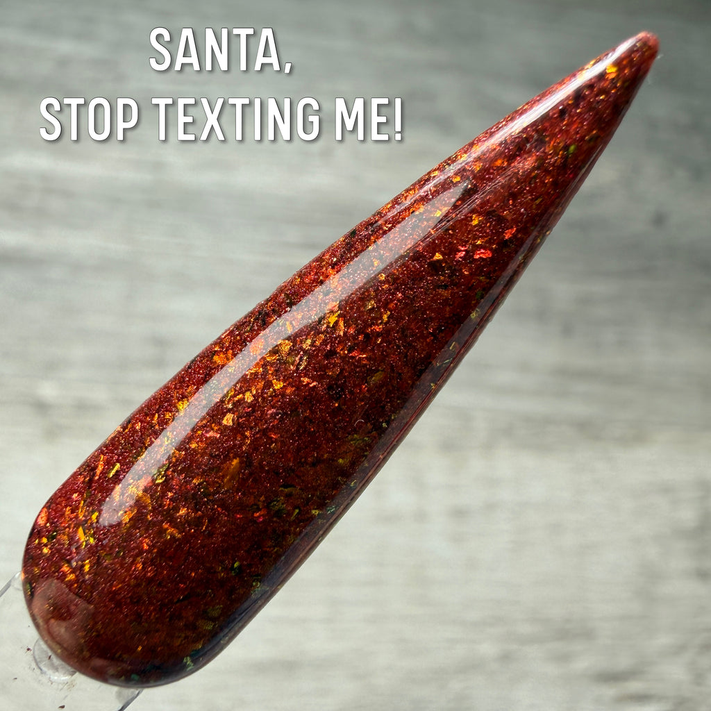 🎅🏼 Santa, Stop Texting Me!🎅🏼 A fiery red packed with glowing copper and gold flakes that shift like embers. Bold, sparkly, and full of attitude.