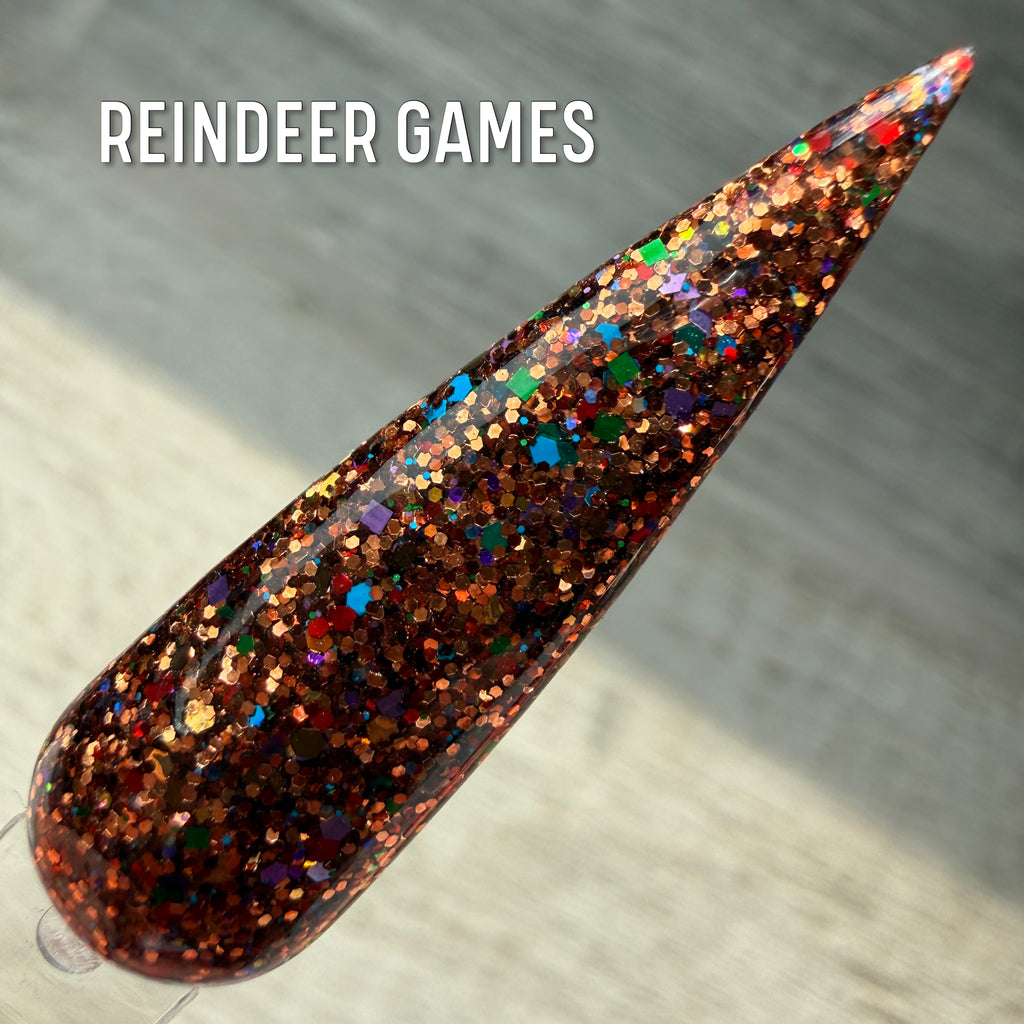 🦌 Reindeer Games 🦌 A cocoa-brown glitter bomb loaded with sparkling copper and pops of festive multicolor shine. Playful, cozy, and full of holiday mischief.