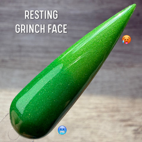 💚 Resting Grinch Face 💚 A mischievous green thermal that shifts subtly between bright Grinch green and a warmer, softer shade. Packed with fine shimmer, it’s playful, bold, and perfect for anyone who embraces their festive attitude—resting face and all.