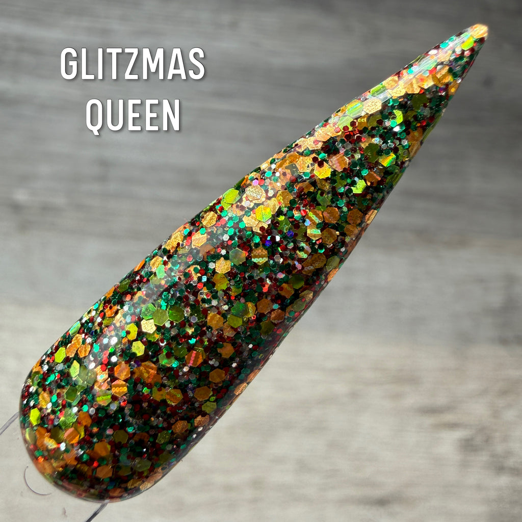 👑 Glitzmas Queen 👑 A full-glam holiday glitter bomb—bursting with sparkling gold, red, and green glitter for the ultimate festive sparkle. Bold, fun, and ready to rule the holiday season.