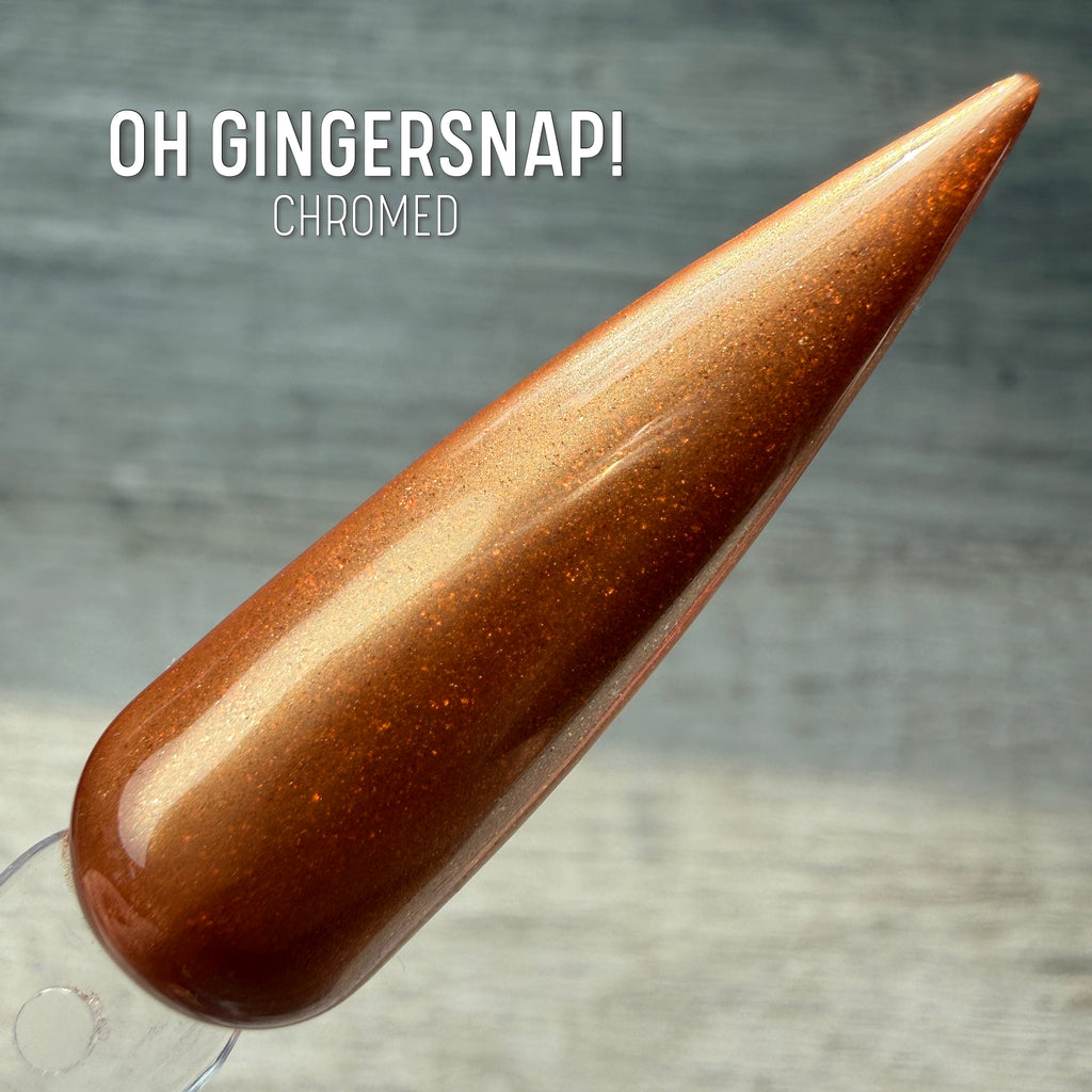 Oh Gingersnap! is a warm, spicy copper packed with golden shimmer like fresh-baked holiday cookies. Worn as a dip, it sparkles softly with a sugary sheen—chrome it, and it transforms into a smooth, molten metallic that looks straight out of a festive cookie tin. Cozy, rich, and deliciously twinkly, this shade brings instant gingerbread-glam to every manicure.