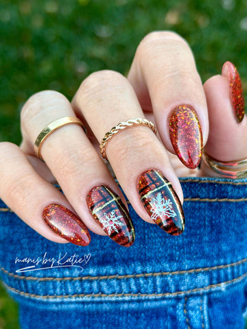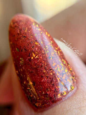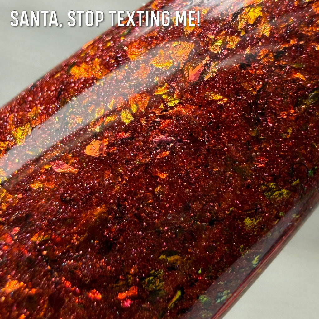 Santa, Stop Texting Me! is a fiery, festive red packed with intense holiday drama. This shade flashes between molten copper, ruby red, and glowing ember tones, all woven together with bold, shifting flakes that sparkle gold, orange, and hints of green. The depth is rich and smoldering—like Santa’s suit under the glow of Christmas lights—while the flakies add a chaotic, glittering energy that perfectly matches the name.